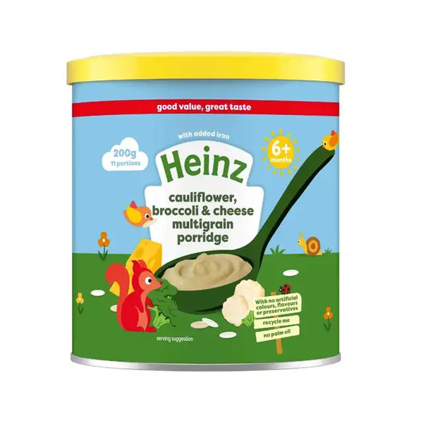 Heinz Cauliflower Broccoli and Cheese Multigrain Porridge, Rise and shine to easy peasy meal times! This porridge is tailored to your 6+ months baby! Your little one will love our smooth oat porridge with milk and added vitamins & minerals. Delicious, easy to make and a source of iron to support your child’s healthy growth and development. Vegetable and cheese cereal with added vitamins and minerals .Use as part of a varied weaning diet.