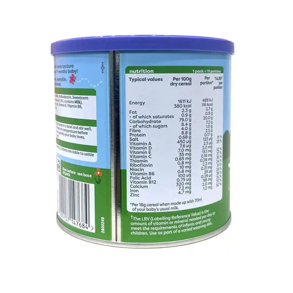 Flavoured cereal with sweetcorn, carrot, pumpkin, cheese and added vitamins and minerals. Rise and shine to easy peasy meal times. With more texture and soft pieces this porridge is tailored to your 7+ months baby!Iron contributes to normal cognitive development in children